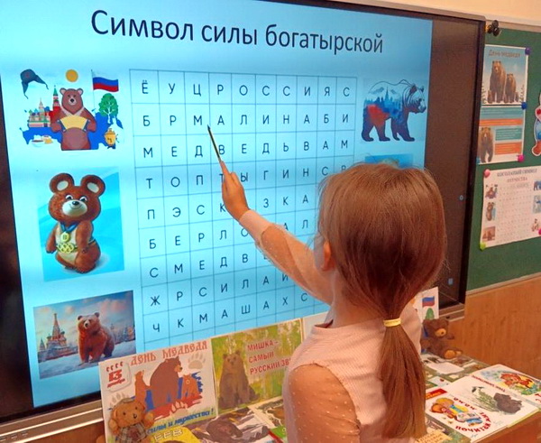 Свои знания символов нашей страны, произведений русского фольклора ребята показали, отвечая на вопросы викторин «Достойные символы нашей Отчизны» и «Сказочный, загадочный, мощный и былинный», решая филворд «Косолапый символ Отечества». Информационным сопровождением познавательного часа стала книжная выставка «Мишка – самый русский зверь!», на которой рядом с книгами уютно разместились фигурки медведей.